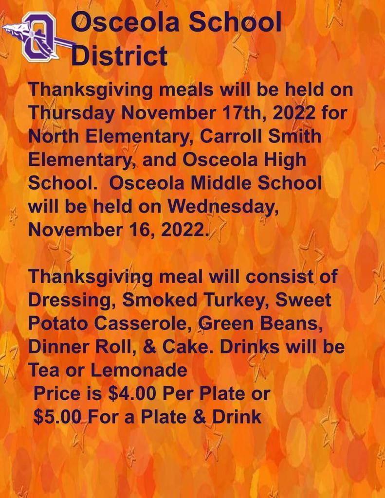 Osceola School District will dismiss One hour early on Friday, November 18, 2022. Osceola School District will be closed November 21st - 25th for Thanksgiving break. School will resume on Monday, November 28, 2022.